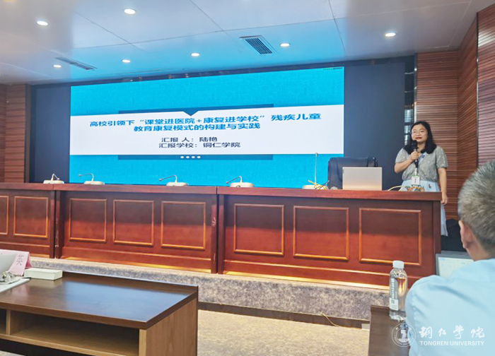 此次优秀教学成果交流展示研讨会分为三个会场进行。陆博士在第二分会场就其教学成果《高校引领下“课堂进医院+康复进学校”残疾儿童教育康复模式的构建与实践》作汇报,围绕“问题的提出、解决问题的办法、成果的主要内容、成果实施前后的成效比较和成果培育建设方案”等方面进行了交流。汇报完毕后,贵州师范大学蒋馨岚、贵州师范学院杨智以及贵阳市第二中学校长段丽英等专家分别作了点评并提出完善建议。