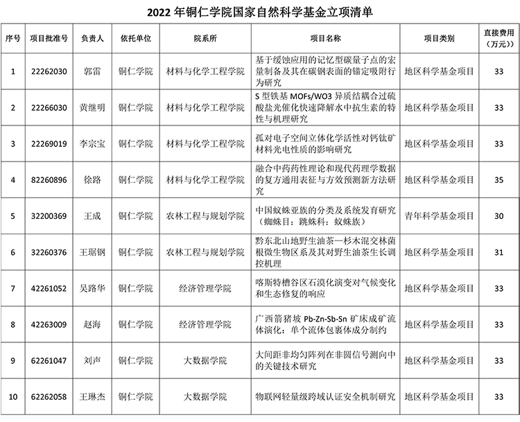 近日,国家自然科学基金委员会正式公布了2022年度国家自然科学基金集中接收申请项目评审结果,我校再次实现新的突破,共有10项课题获得资助,直接经费327万元。立项数和资助经费数均位列贵州省市州高校第一。