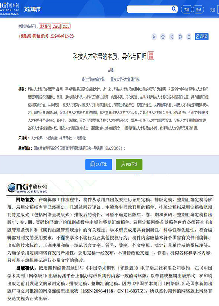 9月5日,国家科学思想库核心媒体、管理学研究领域重要期刊《中国科学院院刊》“政策与管理研究”栏目在线发表我校白强教授的研究成果《科技人才称号的本质、异化与回归》。9月7日,中国知网网络首发该成果。该成果将在《中国科学院院刊》2022年第10期纸质刊印面向国内外公开发行。成果共计10000余字,是白强教授主持的国家社科基金教育学规划课题“知识生产模式变革下高校学科建设高质量发展的路径创新”(立项编号:BIA220053)的又一阶段性研究成果。