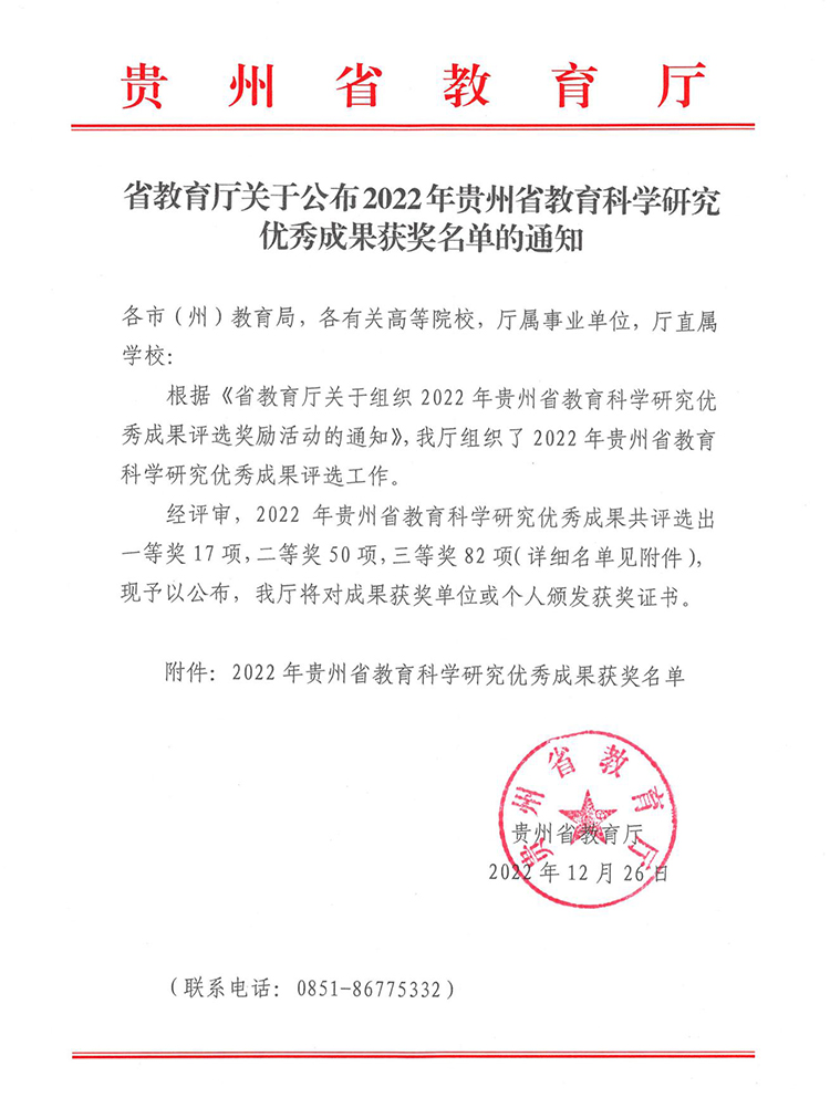 12月26日,省教育厅关于公布了2022年贵州省教育科学研究优秀成果获奖名单,我校报送的5项成果均获奖,其中一等奖2项、二等奖3项,获奖数在全省高校中位列第4,创下了我校在此奖项上的最好成绩。这充分展现了我校教育学科的研究实力与水平,有效推进了我校科技事业的高质量发展。