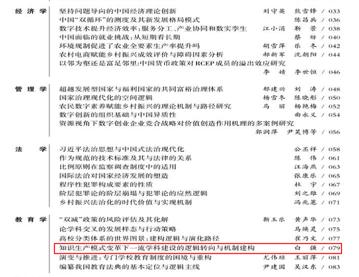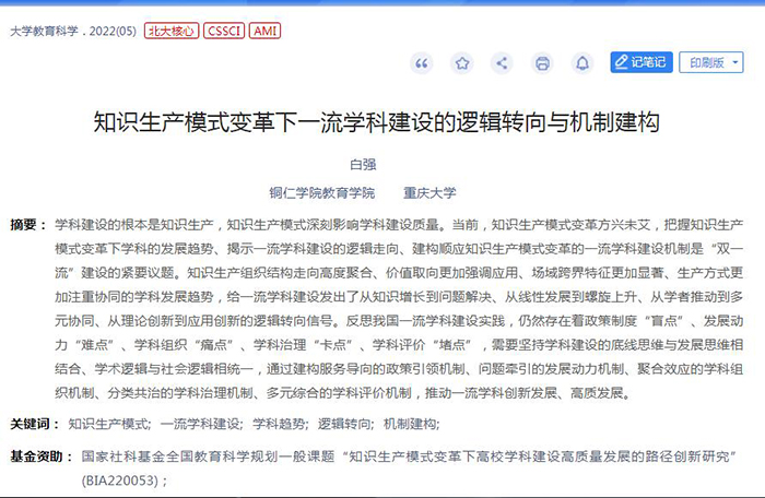 该文章系白强教授主持的国家社科基金教育学国家一般课题“知识生产模式变革下高校学科建设高质量发展的路径创新研究”(立项编号:BIA220053)的研究成果之一。成果在深入分析知识生产模式深刻变革下学科发展趋势的基础上,揭示了一流学科建设的逻辑走向,提出了推动一流学科高质量发展的机制建议,为我国新一轮“双一流”建设提供了新的洞见,受到学界重视和关注。