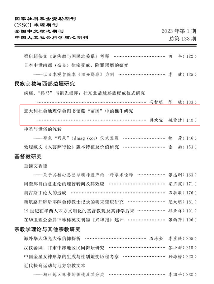 日前,《宗教学研究》第1期刊发了我校哲学与历史文化学院教师蒋欢宜、姚雪洁的学术论文《意大利社会地理学会图书馆藏“苗图”中的椎牛研究》。