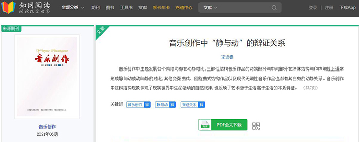 近日,我校艺术学院李运春博士的最新研究成果《音乐创作中“静与动”的辨证关系》在音乐学科权威期刊、全国中文核心期刊《音乐创作》2021年第6期上发表。