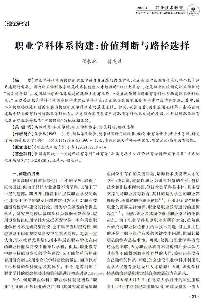 近期,我校校长、二级教授、教育学博士侯长林与其所带硕士研究生蒋炎益合作的论文《职业学科体系构建:价值判断与路径选择》被中国人民大学复印报刊资料《职业技术教育》2022年第3期(21-29页)全文转载。该论文有12000余字,原发表于中文核心期刊《职业技术教育》2021年第27期,系贵州省区域一流建设培育学科(教育学)项目(201785)阶段性成果。