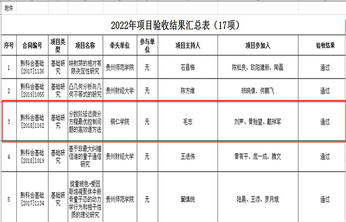 近日,由我校大数据学院毛志教授主持的贵州省科技基础研究计划项目“分数阶延迟微分方程最优控制问题的高效谱方法”,顺利通过结题验收。