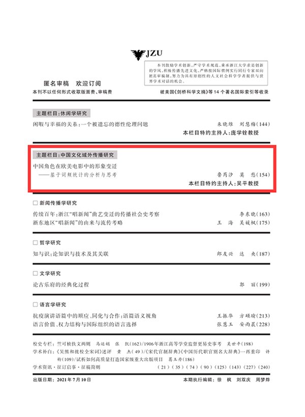 近期,我校国际学院鲁芮汐副教授以第一作者在高校学报类重要期刊《浙江大学学报(人文社会科学版)》2021年第4期发表论文《中国角色在欧美电影中的形象变迁——基于词频统计的分析与思考》。