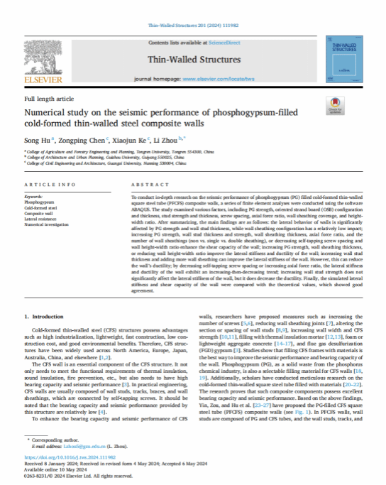 近日,我校农林工程与规划学院胡松博士在《Thin-Walled Structures》发表了题为“Numerical study on the seismic performance of phosphogypsum-filled cold-formed thin-walled steel composite walls”的研究论文。该论文以铜仁学院为第一署名单位。