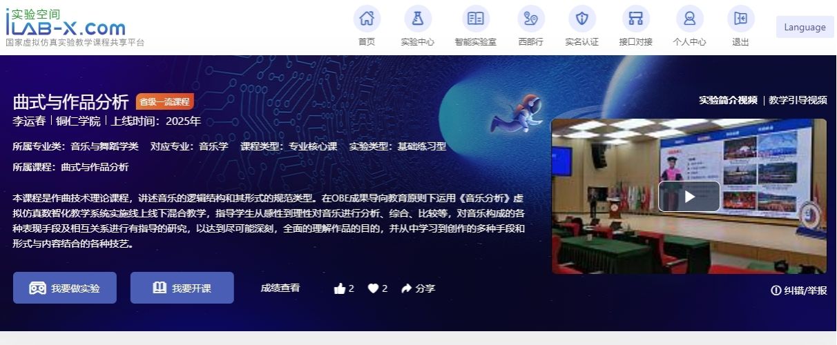 近日,我校艺术学院李运春博士主持建设的省级一流课程《曲式与作品分析》成功入驻“实验空间ilab-x”国家虚拟仿真实验教学课程共享平台,成为贵州省首个登陆该国家级平台的音乐类虚拟仿真课程。