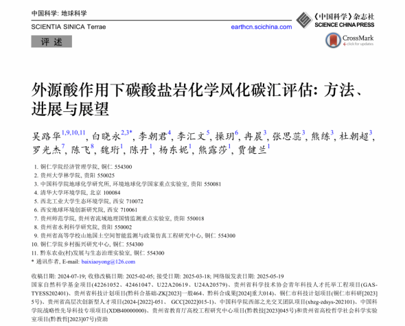 5月19日,我校经济管理学院吴路华教授在国际权威期刊《Science China Earth Sciences》和《中国科学:地球科学》(中科院1区Top SCI,IF=6)同时在线发表题为《Assessment of carbon sinks caused by the chemical weathering of carbonate rocks under the influence of exogenous acids: Methods, progress, and prospects》与《外源酸作用下碳酸盐岩化学风化碳汇评估:方法、进展与展望》的2篇研究论文。该论文一刊双版(中文版与英文版),由吴路华教授作为唯一第一作者,中国科学院地球化学研究所白晓永研究员为唯一通讯作者,联合贵州大学、清华大学、西北工业大学等多家科研机构共同完成。