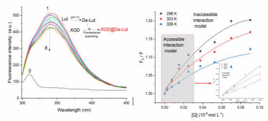 该研究是依托课题组构建的“地方本科院校材料与化工类新工科人才创新实践能力培养体系”,是该教育模式下产出的又一重要成果。研究聚焦于类黄酮抑制剂(木犀草素及其类似物)对黄嘌呤氧化酶(Xanthine oxidase, XOD)活性的抑制机制,为功能食品的开发提供了一个新的视角。研究结果表明,木犀草素及其类似物经去质子化形成的酚类物质是有效的抑制剂,对XOD产生的超氧化物有不同程度的影响。在热力学分析中,不同温度下F0/F与[Q]的Stern-Volmer图未能证明多项式-线性拟合,而是在不同程度上接近x轴,这偏离了预期的良好线性关系,提示抑制的热力学可能与浓度有关。在较低浓度下,抑制剂与酶形成的基态复合物以静态荧光猝灭为主,表现出良好的线性拟合;而高浓度下呈现出非接触型作用机制,反映为猝灭强度减弱的非线性特征。此外,抑制动力学研究表明,木犀草素类化合物表现出浓度依赖的混合型抑制模式(兼具竞争性和非竞争性特征)。同步荧光分析与分子对接结果进一步证实了抑制剂与XOD之间存在特异性相互作用。该研究在深入阐释抑制机制的基础上,拓展了黄酮类天然产物作为XOD抑制剂的潜在应用价值。