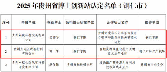 近日,贵州省科协、省知识产权局等四部门联合发布了2025年贵州省博士创新站认定名单。我校常军、吴路华两位博士分别与贵州大龙汇成新材料有限公司、贵州铜院科技发展有限公司联合组建的博士创新站成功入选。这两个创新站的建立,不仅搭建了产学研合作的新平台,更通过博士及其团队与企业间的深度合作,为当地产业升级和经济发展注入了新的动力。
