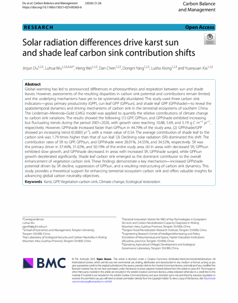 近日,我校经济管理学院2022级地理科学专业本科生杜进军国际期刊Carbon Balance and Management》(中科院二区SCI,IF=6.7)上发表学术论文Solar radiation differences drive karst sun and shade leaf carbon sink contribution shifts铜仁学院经济管理学院为第一署名单位,杜进军为第一作者,吴路华教授为通讯作者,合作者包括2023级农村发展硕士研究生魏珩,2024级农村发展硕士研究生陈丹、杨东妮、熊露莎,以及2024级地理科学本科生夏圆圆。