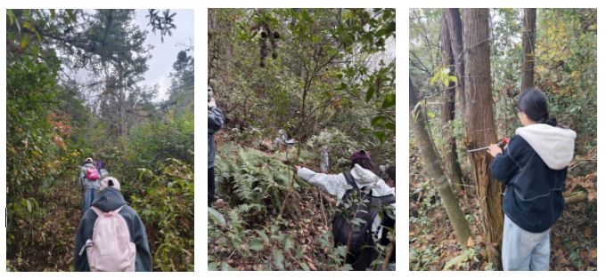 11月19日,任务:森林经理调查。结合《森林经理学》课程内容,学生们实地划分森林类型,调查林分结构、天然更新状况与健康程度,分析森林经营管理的关键要素,进一步理解森林生态系统运作机制,提升对林业生产管理环节的认知。