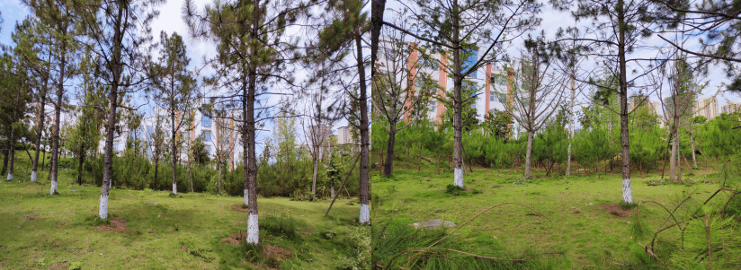 左图抚育前的马尾松幼林,右图为林抚育后的马尾松幼