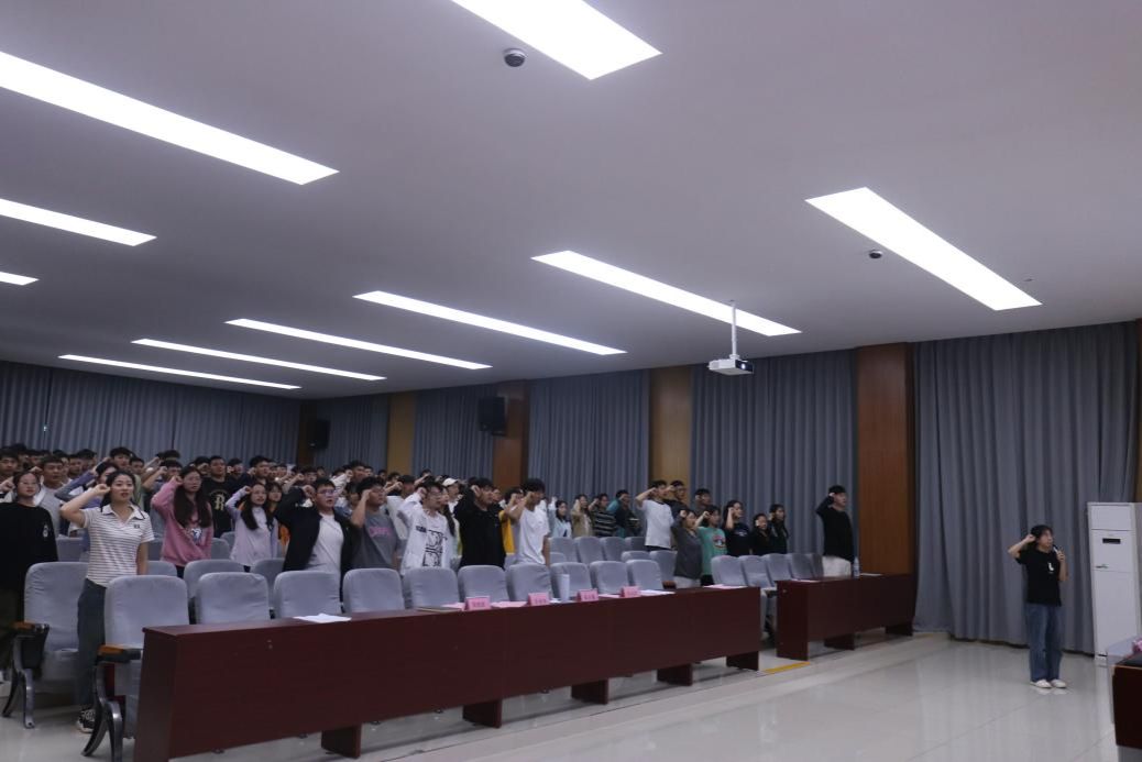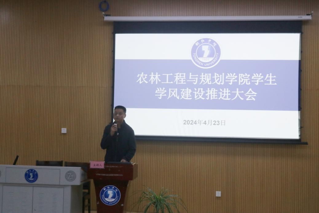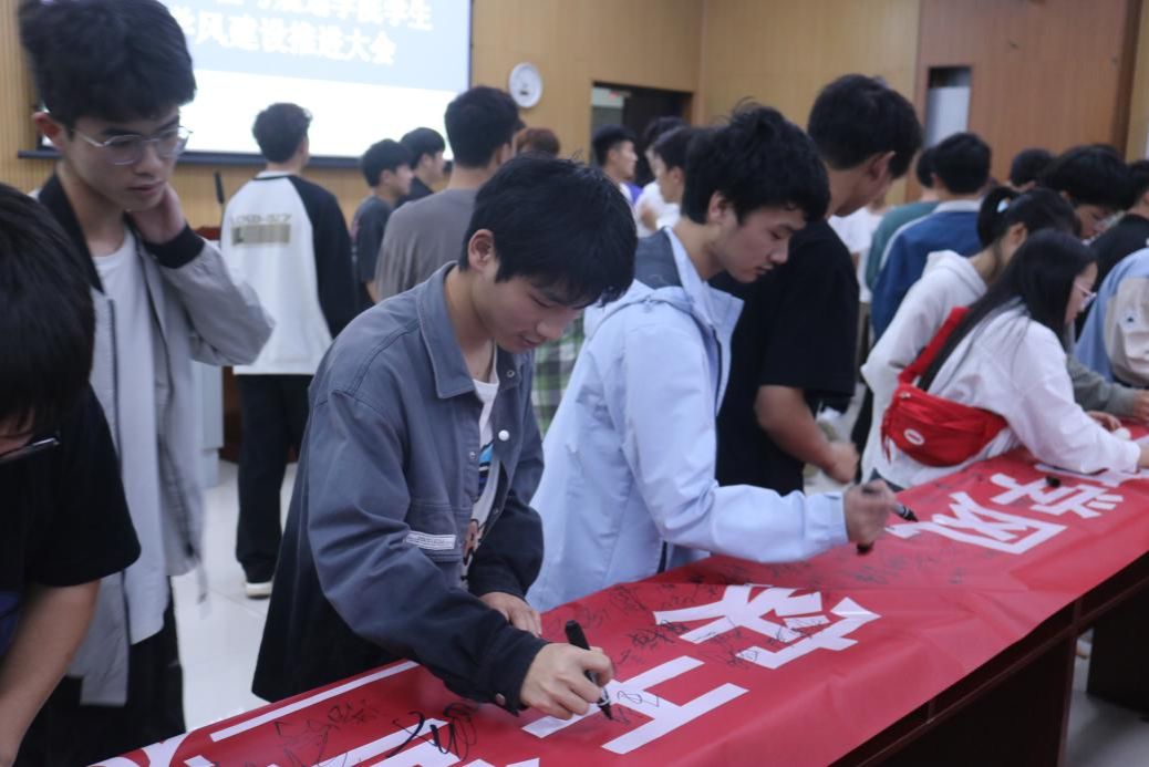 大会在庄严的国歌声中拉开帷幕。会上,张俊波宣读了《铜仁学院2024年学生学风建设实施方案》,指出全体师生要把握好学风建设总体要求,积极主动投入到学风建设工作中,有针对性地开展学风建设活动,切实培养学生的主动性和积极性。李建新宣读了近期学生违纪的相关文件,通报中包括学生考试舞弊、赌博、酗酒斗殴等问题,指出全体学生要引以为戒,充分认识到违规违纪的重要性,严格遵守学校学生管理规定,守牢校园安全底线。学生代表李沁瑾(20级水产养殖学专业)作为了发言,分享了个人学习经历和所在班级四年的整体青春风采和先进事迹,讲述了学风建设对班级管理的重要性,鼓励同学们要爱自己的学习、自己的班级、自己的学校,要带着目的学习,提前做好规划,这样才能提升学习效率。学生会干部潘婷带领全体参会同学庄严宣誓,激励自己要端正学习态度,坚定理想信念,在筑牢学风建设上以身作则,宣誓完后并在横幅上签字。最后,米小其作了重要讲话,就我院学生学风建设工作提出了具体要求:一是要高度重视,加强领导,充分认识学风建设的重要性;二是要围绕“爱国、励志、求真、力行”,积极参与和创建优良学风;三是要围绕“四有好老师”,当好引路人,成为“大先生”。