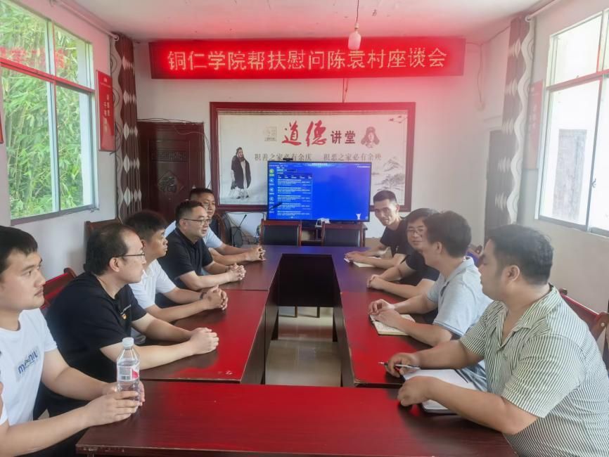 潮砥镇副镇长张怀稳主持双方座谈会,潮砥镇党委书记陈吴、陈袁村党支部书记简学恒、村主任张金霞等同志参会。陈吴代表镇党委、政府对我院师生一行表示热烈欢迎,衷心感谢铜仁学院长期以来对潮砥镇,特别是对陈袁村的关心与支持,对张绍阳辛勤付出给于充分肯定。陈吴表示,学院的帮扶是推动陈袁村发展的重要力量,镇党委、政府将全力配合学院开展各项工作,共同促进乡村全面振兴。随后,简学恒、张绍阳先后详细介绍了乡村基本情况、产业发展现状(重点提及关家沟水产、陈世兵鱼塘、袁伟养鸡场及村集体香柚产业)、当前面临的主要困难(如香柚产业未入正轨、部分村民生活困难等)以及发展规划等,希望学院能在产业技术指导、人才支持、资源对接等方面给予陈袁村更多帮助。最后,李建新代表学院感谢镇村两级领导的热情接待和对驻村工作的支持。他介绍了此行的目的:一是看望慰问驻村教师张绍阳;二是实地调研,精准对接帮扶需求;三是带领青年学子深入基层实践。李建新表示,学院将认真梳理座谈会上了解的情况,结合自身优势,在产业帮扶、人才培训、乡村治理等方面尽力提供支持,并希望以此次“三下乡”社会实践活动为契机,建立紧密的校地合作关系,助力陈袁村绘就振兴新图景。