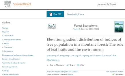 我院王祖华博士长期从事林学的研究,近日,在林学领域取得了重要研究进展,相关成果“Elevation gradient distribution of indices of tree population in a montane forest:The role of leaf traits and the environment”为题发表在中国科学院1区期刊Forest Ecosystems(Volume 9, December 2022, 100012;IF=3.645)上。