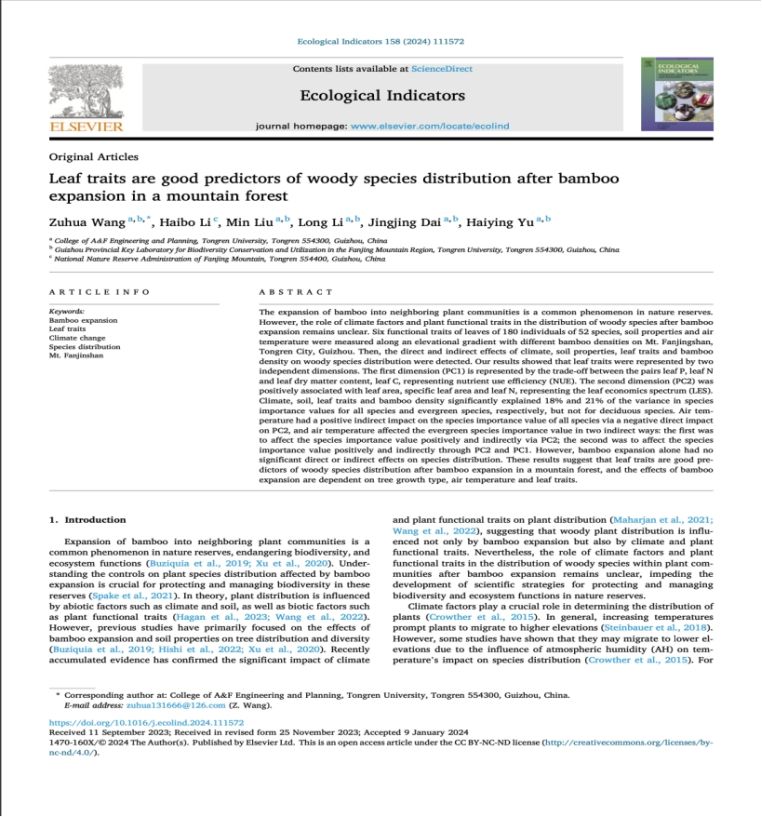 近日,我院王祖华博士在《Ecological Indicators》发表了题为“Leaf traits are good predictors of woody species distribution after bamboo expansion in a mountain forest”的研究论文,铜仁学院为第一署名单位,王祖华为第一及通讯作者,合作者为李海波(校外)、刘敏、李龙、戴婧婧和于海英。