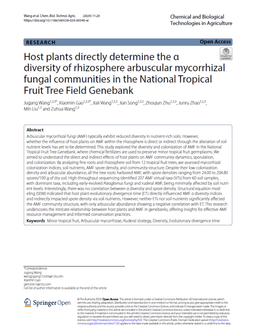 近日,我院王琚钢博士在《Chemical and Biological Technologies in Agriculture》发表了题为“Host plants directly determine the α diversity of rhizosphere arbuscular mycorrhizal fungal communities in the National Tropical Fruit Tree Field Genebank”的研究论文,铜仁学院农林工程与规划学院为第一署名单位,王琚钢为第一及通讯作者,高晓敏为共同通讯作者,2023级农艺与种业硕士研究生王加利、宋健,以及农林工程与规划学院教师朱周俊、赵君茹、刘敏和王祖华共同参加了本项工作。