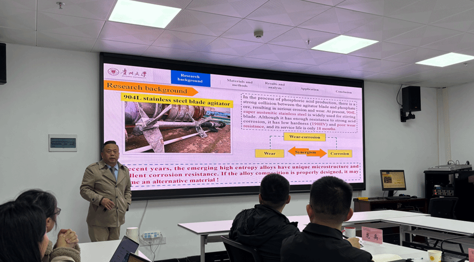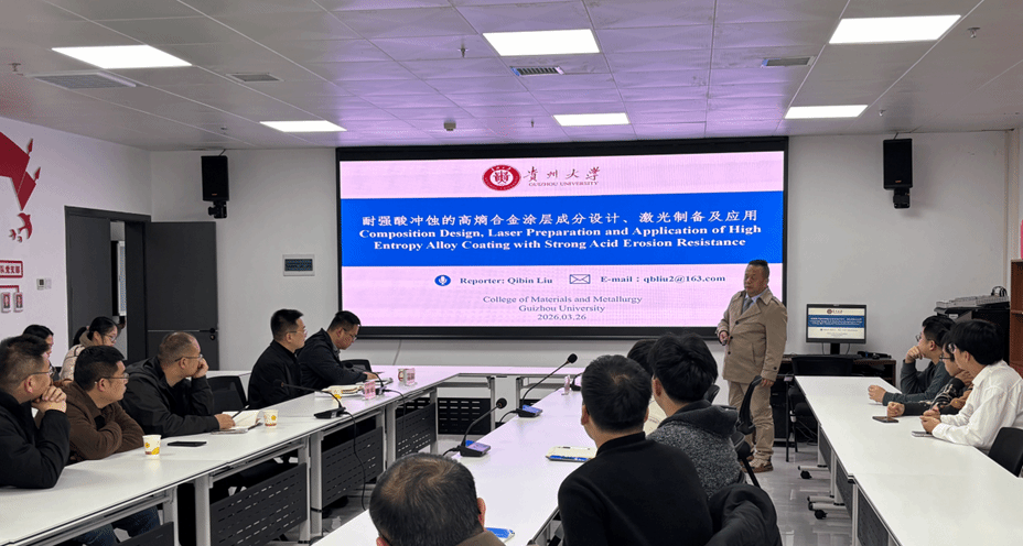 2026年3月26日,为进一步拓宽学生学术视野,增强科研创新意识,提升学科建设与人才培养水平,我院特邀贵州大学材料与冶金学院刘其斌教授莅临讲学,并围绕学科建设、科研组织和研究生培养等工作开展专题指导。刘其斌教授以“耐强酸冲蚀高熵合金涂层成分设计、激光制备及应用”为题,为材料与化学工程学院师生带来了一场紧贴产业实际、兼具学术深度与应用价值的精彩讲座。