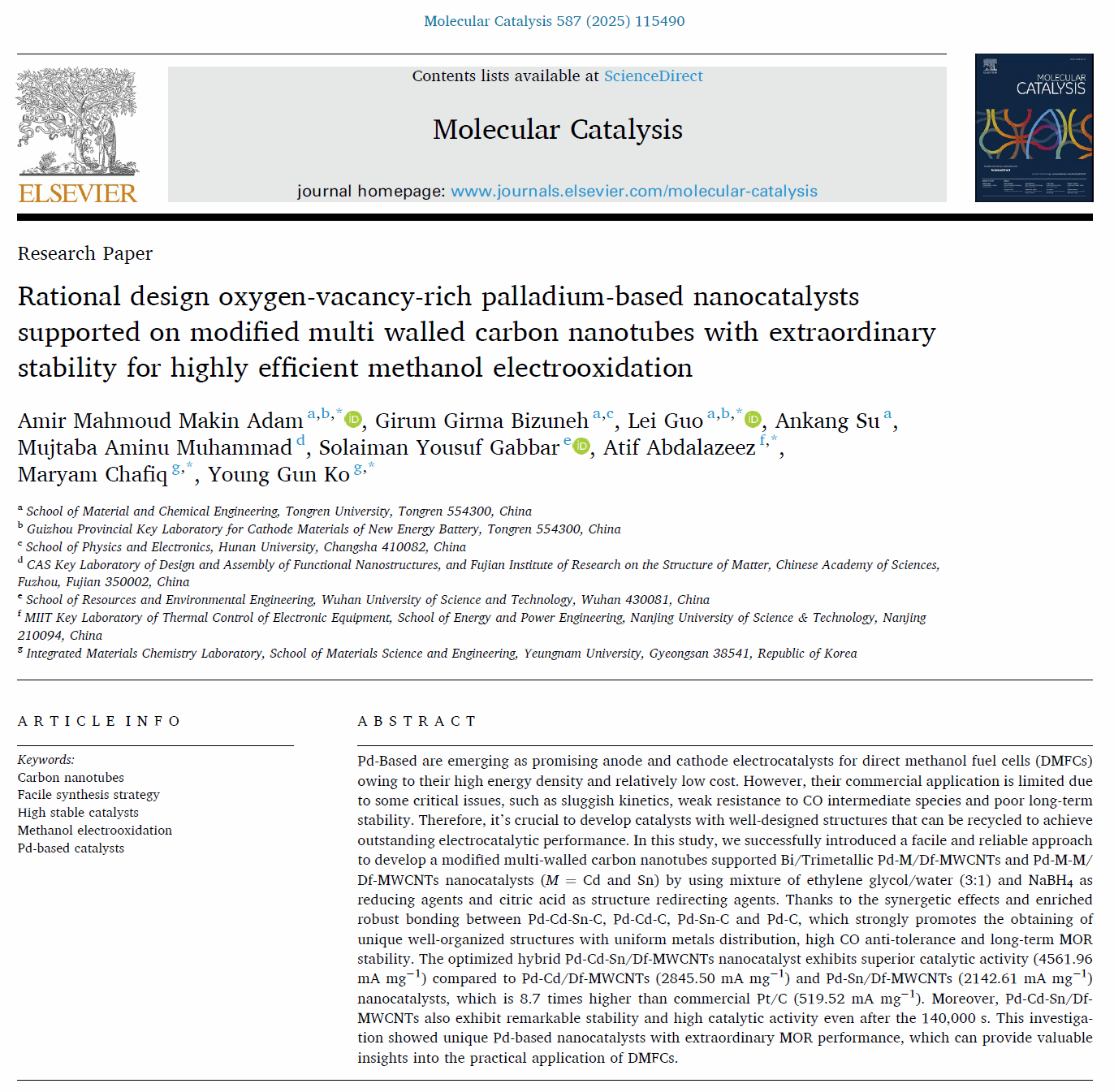 近日,催化领域知名期刊《Molecular Catalysis》发表了我院材料电化学与表界面工程课题组的最新研究成果,论文题目为“Rational design of oxygen-vacancy-rich palladium-based nanocatalysts supported on modified multi-walled carbon nanotubes with extraordinary stability for highly efficient methanol electrooxidation”。该研究以铜仁学院作为第一完成单位,我院外籍教师Amir Mahmoud Makin Adam为论文第一作者。《Molecular Catalysis》是催化科学领域的国际权威期刊,最新影响因子为4.9。