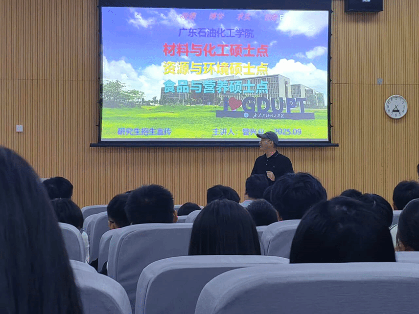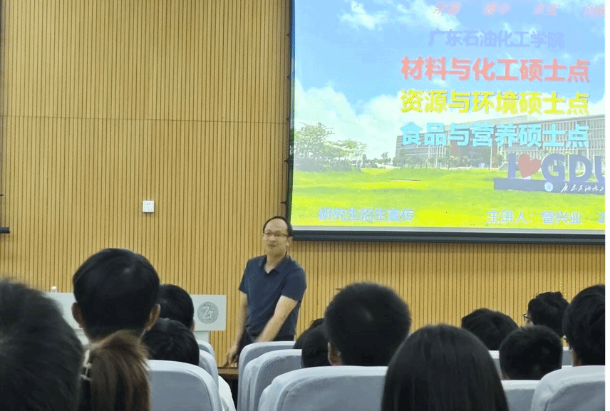 2025年9月21日,广东石油化工学院化学工程学院曾兴业副院长一行受邀在我校博思楼105教室举办研究生招生宣讲会,为我院化工和材料专业学子带来院校研究生专业解读与报考指导。院党委书记吴思展教授主持宣讲会,我院化工系主任任富忠及广东石油化工学院化学工程学院相关老师出席。