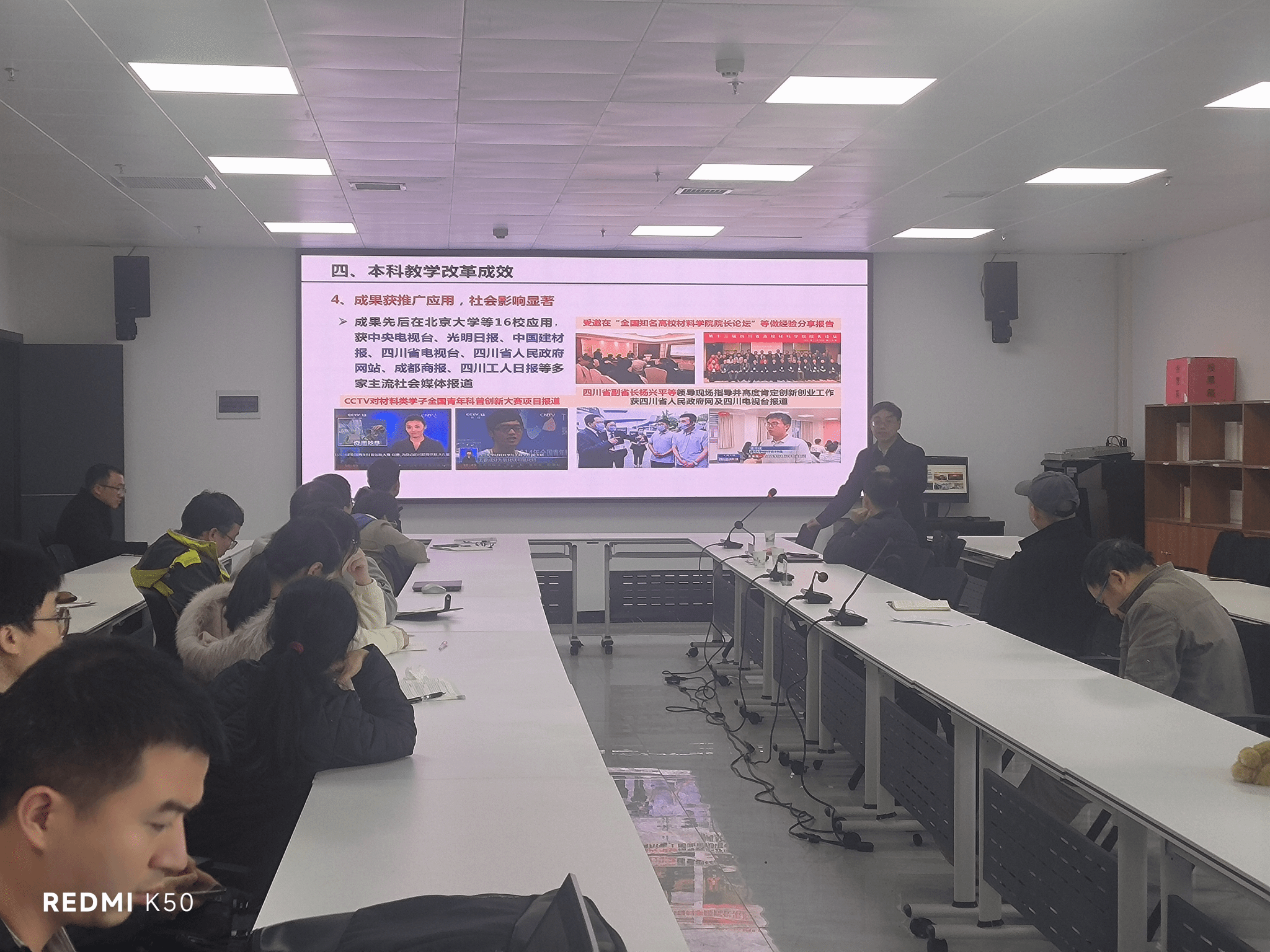随后,刘颖教授以《材料类专业本科人才培养模式重构与实践》为题作报告。刘教授为国务院政府特殊津贴专家、教育部“新世纪优秀人才”,自1991年起在四川大学从事教学与科研工作,主持课题50余项,发表论文150余篇,获多项国家及省部级奖励。报告中,刘教授结合四川大学的改革实践,系统剖析了当前材料类专业人才培养面临的挑战与机遇,强调应顺应科技变革和产业升级趋势,从培养目标、课程体系、实践教学、国际化视野等方面重构创新型人才培养体系,为我院教育教学改革提供了宝贵借鉴。