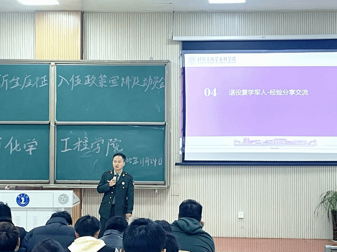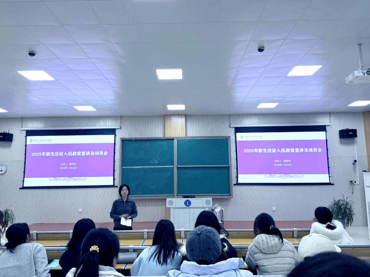 为积极响应国家征兵号召,帮助2025年新生全面了解应征入伍政策要点,进一步激发青年学子参军报国的责任感与使命感,11月24日,我院于博思楼102、104教室同步举办2025年新生应征入伍政策宣讲暨动员会。学生科向媛老师、辅导员廖世佳老师担任主讲,学院2025年本科及专升本全体新生踊跃参与。