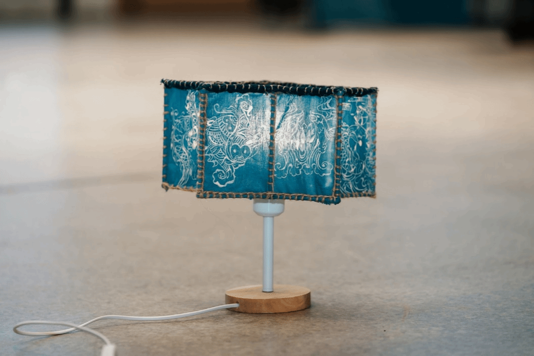 “苗光蜡染”项目聚焦“黔乡潮创”主题,以贵州传统苗族蜡染技艺为核心,跳出“非遗=老物件”的刻板印象吗,团队通过将蝴蝶妈妈、龙鱼等苗族文化符号融入蜡染智能装置设计,让传统苗族蜡染插上科技的翅膀,焕发出新的生机与活力。比赛现场,团队成员王佳艺身着绣有蜡染纹样的民族服饰,演示了核心作品——蜡染智能花灯:轻触开关,蓝白蜡染花瓣随机械结构舒展,苗族图腾纹样在灯光下晕染出传统与现代交织的美感,既保留了蜡染“冰纹”的独特质感,又通过“非遗+智能”的形式贴合当代审美。