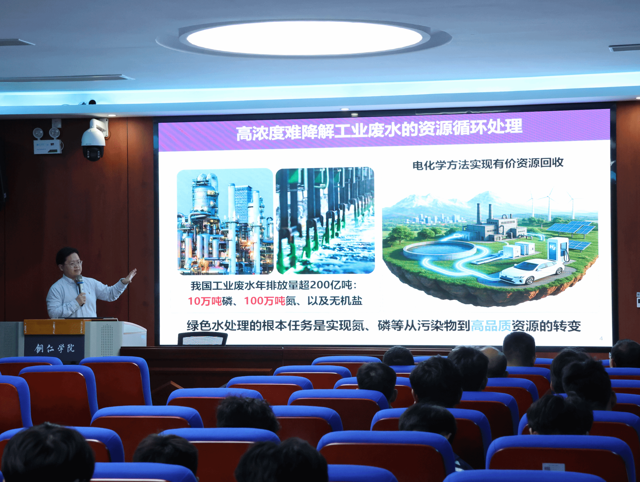 讲座中,张弓围绕工业废水处理与资源循环利用前沿问题,系统介绍了绿色电化学控制技术的基本原理、关键方法及应用前景。结合国内外研究进展、团队科研成果和典型案例,他深入分析了绿色电化学技术在污染物高效去除、资源回收利用和节能降耗等方面的优势,展示了该领域的最新研究进展和发展趋势。交流环节中,张弓围绕工业废水处理关键技术难点、绿色低碳发展需求及相关学科研究热点,与现场师生进行了深入交流,并认真解答了师生提出的问题。讲座内容丰富、针对性强,进一步加深了师生对工业废水资源循环与绿色电化学控制技术的认识与理解。