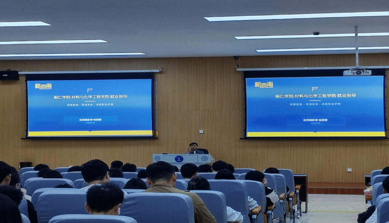 为切实做好材料与化学工程学院2026届毕业生就业服务工作,帮助同学们再次明晰就业方向、提升求职技能、增强职场竞争力,4月9日14:30,我院特邀贵州新西南教育专家杨朝棚,于博思楼105教室举办“2026届毕业生就业形势分析与面试技能专项培训”。讲座由我院学生科(团委)科长(书记)向媛老师主持,贵州新西南教育团队及专家杨朝棚应邀到场,全院2026届材料、化工等专业毕业生200余名及部分23级学生到场聆听。