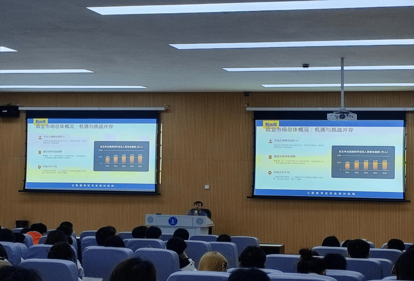 本次讲座由新西南教育教研中心拥有多年公考培训经验的负责人杨朝棚主讲,内容紧扣毕业生求职全流程痛点,分为四大核心模块。其一为全国就业现状与趋势洞察,讲师结合宏观经济形势,全面解读全国就业市场现状、发展趋势及人才需求导向,帮助同学们客观认识就业大环境,树立理性就业认知。其二是学院专业就业趋势分析,立足我院各专业培养特色,结合往届毕业生案例,针对性分析各专业就业方向、对口行业及岗位需求,明确专业优势。其三为企业求职面试与简历攻略,聚焦企业求职痛点,讲解简历打造技巧与面试全流程要点,助力提升企业求职竞争力。其四是公职备考指南,为有公职备考需求的同学,介绍国省考、事业单位考试的报考流程、备考方法及误区,提供清晰指引。