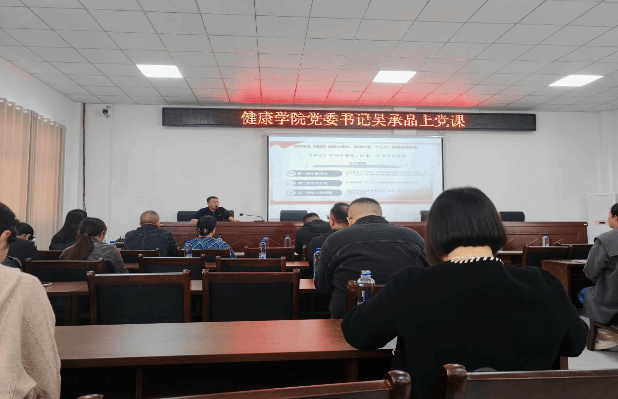 活动第一项内容为大健康学院党委书记吴承品讲党课。吴书记以“点到式”宣讲方式,简明扼要介绍了二十届四中全会的核心内容。吴书记强调,学习贯彻全会精神是当前和今后一个时期的重大政治任务,要求全体党员逐字逐句研读公报,通过“三会一课”、政治理论学习等多种形式,深刻领会文件中的指导思想、方针原则与发展目标。作为党员,需明确党和国家发展方向,将“听党话、跟党走”的信念转化为实际行动,把学习成果融入日常工作。