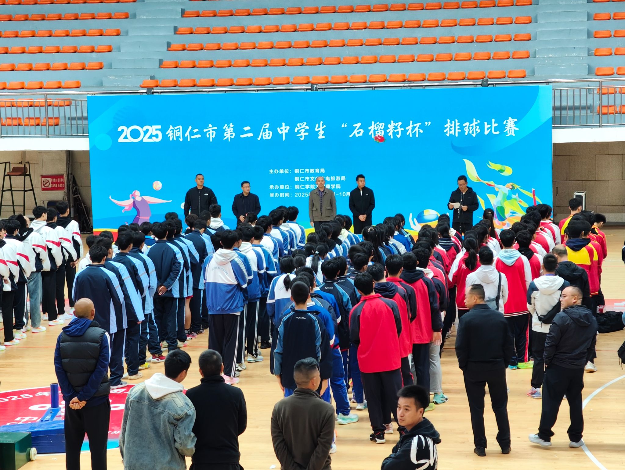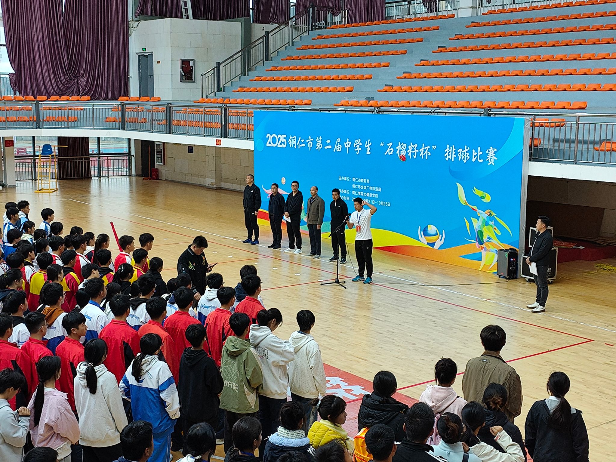2025年10月21日,铜仁市第二届中学生“石榴籽杯”排球比赛开幕式在铜仁学院体育馆举行。本届赛事由铜仁市教育局、铜仁市文体广电旅游局联合主办,由铜仁学院大健康学院承办,来自全市各区县的29支代表队、近500名运动员、教练员及裁判员齐聚一堂,现场气氛热烈。铜仁市教育局基础教务科科长代华强,大健康学校党委书记吴承品、院长余静、副书记王洪、裁判长王道才等出席开幕式,共同见证了这一庄严而充满活力的时刻。