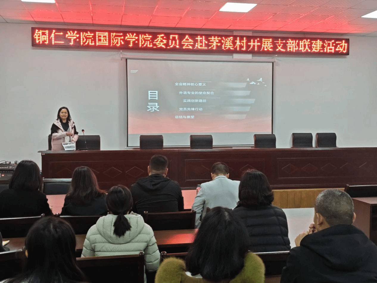 为深入贯彻落实新时代党的建设总要求和二十届四中全会精神,创新党建工作载体,增强基层党组织活力,11月17日国际学院党委的两个基层党支部赴铜仁市碧江区茅溪村党支部共同开展了结对联建主题活动。茅溪村党支部书记肖凯及村委成员全程参与活动。
