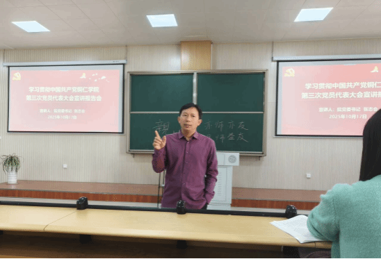 10月17日下午,国际学院党委书记张志会在博思楼203教室为24级英语专业学生宣讲中国共产党铜仁学院第三次党员代表大会精神。