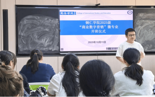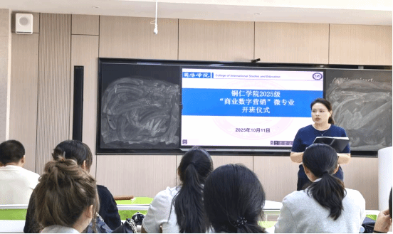2025年10月11日,铜仁学院2025级“商业数字营销”微专业开班仪式在明理楼A301教室举行。国际学院副院长杨芹,2025级微专业负责人兼班主任孙用常,2024级微专业班主任杨婷,微专业线下课程任课老师饶华宏以及2025级商业数字营销微专业全体学生,参加了开班仪式。仪式由孙用常主持。