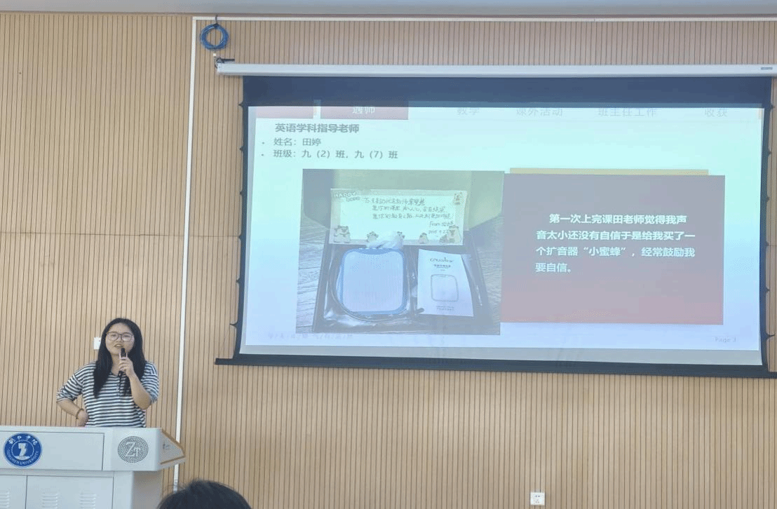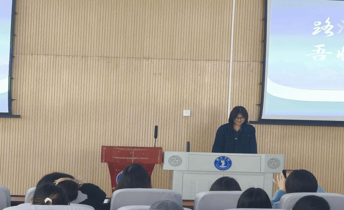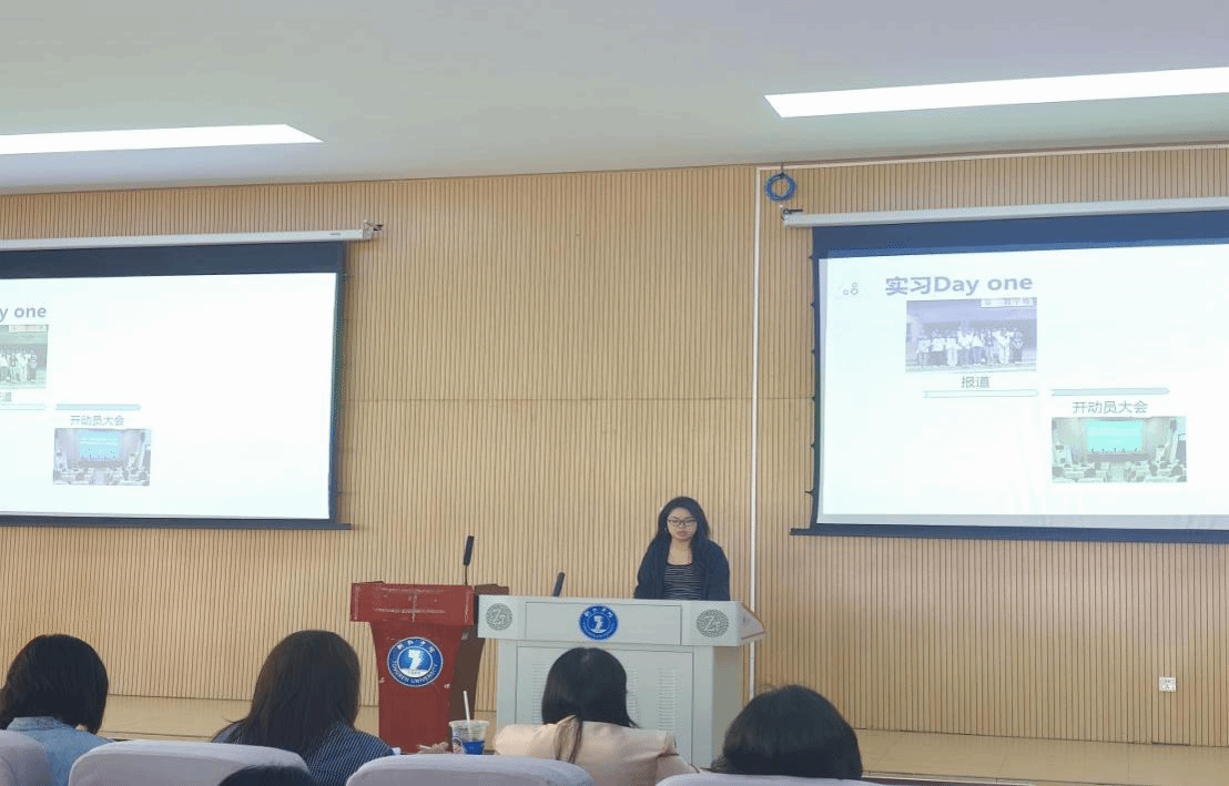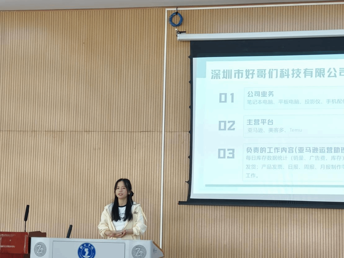 接着,学生代表依次上台分享实习心得。在德江七中、铜仁学院附属中学、德江实验中学的王芳、韩雪玲、覃晓慧同学,结合中学英语教学实践,分享课堂教学、班级管理、师生沟通中的经验与感悟;在深圳市头狼电商科技有限公司实习的全飞叶、潘学芳同学,分别从跨境电商运营、商务实操等角度分享职场历练与成长收获。其中潘学芳同学因已在实习单位就职未能到场,特意通过视频的方式展示实习成果,生动展现了在不同实践领域的风采。