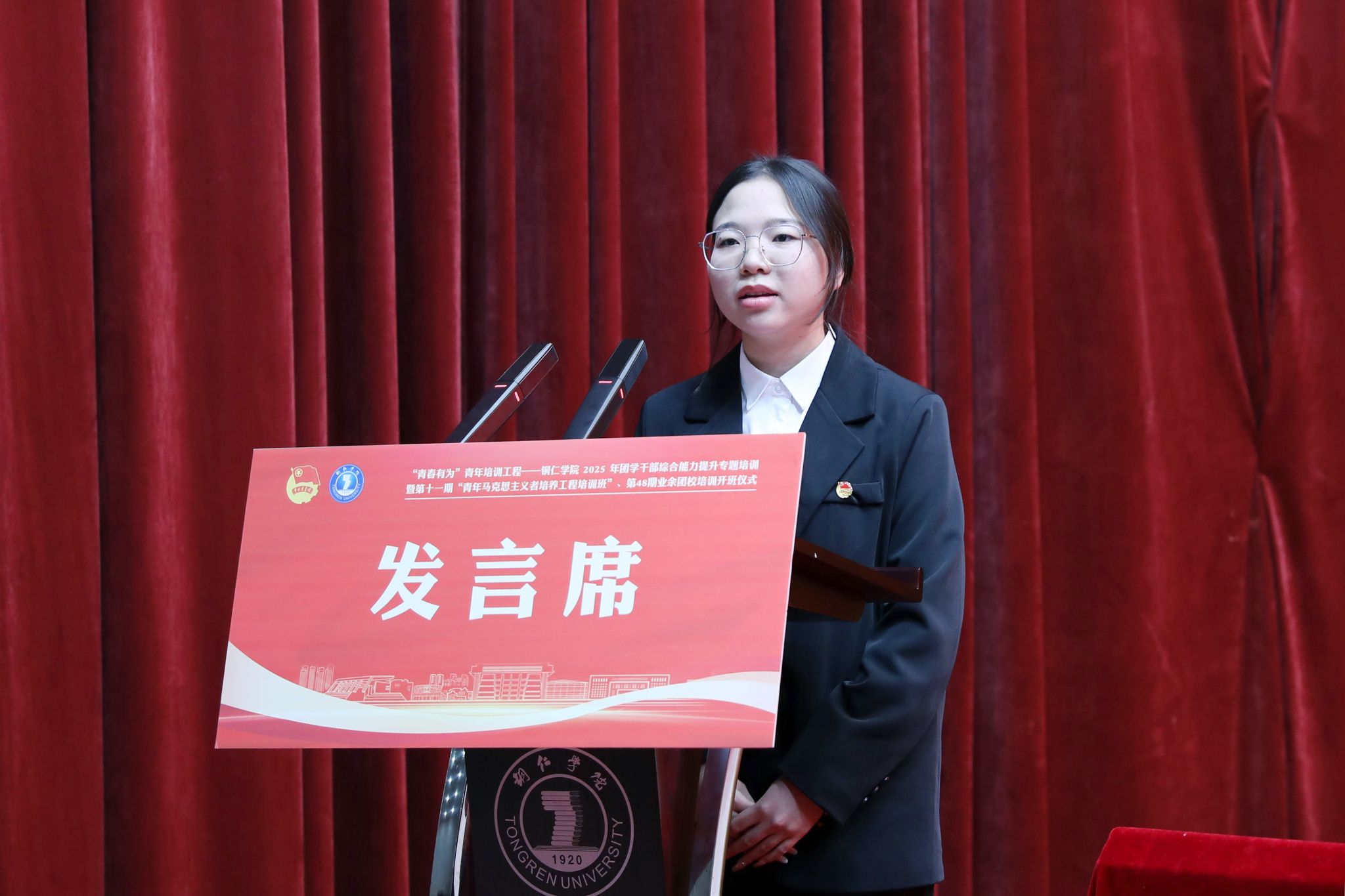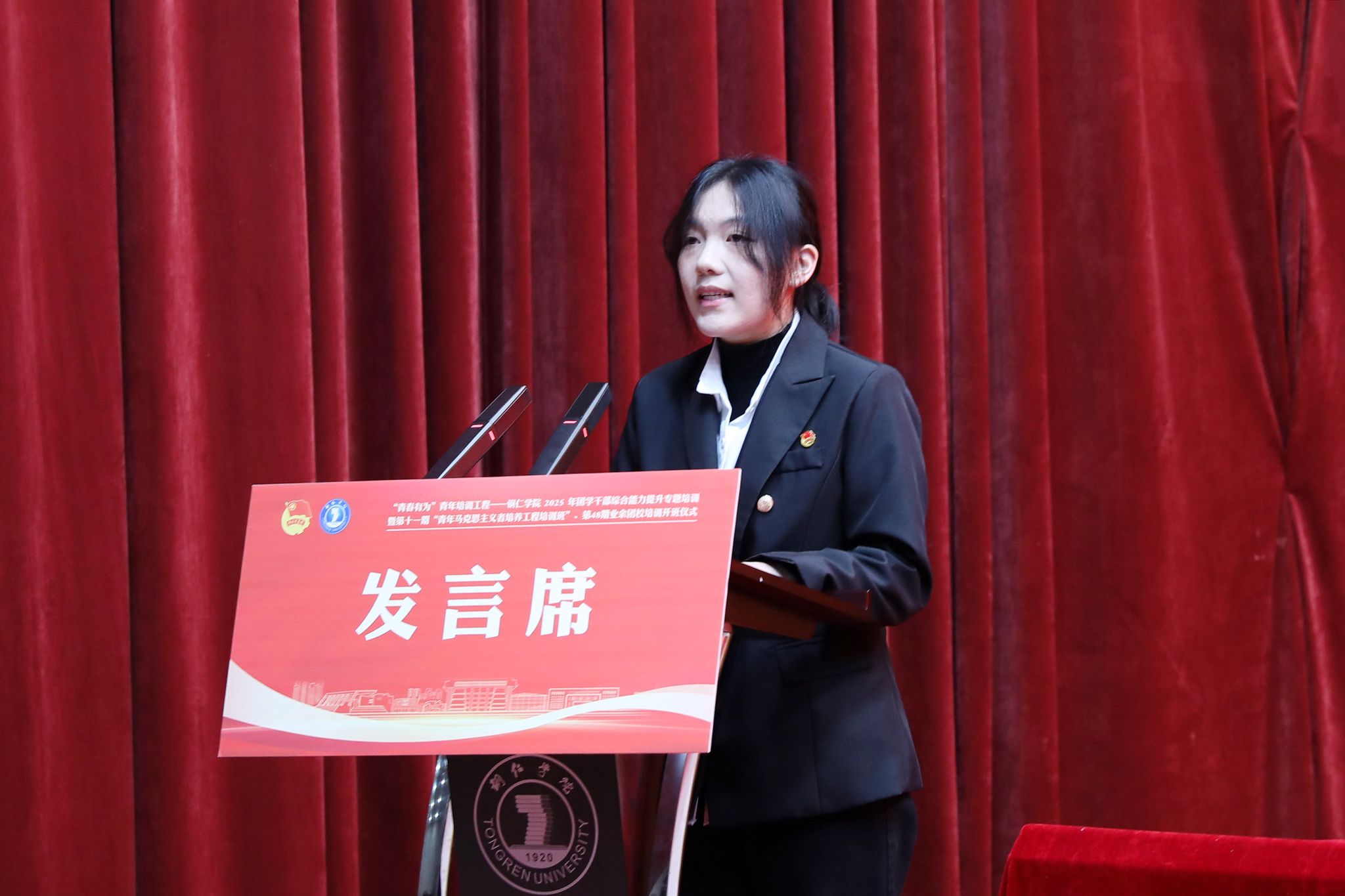 仪式上,朱钰代表学校党委对培训班的顺利开班表示祝贺,并向全体学员提出三点希望:一是要擎牢“理想信念”火炬,做信仰坚定的模范,深入学习贯彻习近平新时代中国特色社会主义思想,做到真学、真懂、真信、真用;二是要修炼“刻苦学习”内功,做锐意创新的先锋,珍惜学习黄金期,拓宽知识视野,提升综合素质;三是要弘扬“奋斗担当”精神,做甘于奉献的榜样,将学习成果转化为服务社会、建设祖国的实际行动,在推进学校高质量发展中展现青春风采。他强调,全体学员要牢记习近平总书记的谆谆教诲,努力成长为有理想、敢担当、能吃苦、肯奋斗的新时代好青年,以此次培训为新起点,踔厉奋发、砥砺前行,为把我校建设成为特色鲜明的高水平应用型大学,为谱写中国式现代化贵州实践铜仁新篇章贡献青春力量。