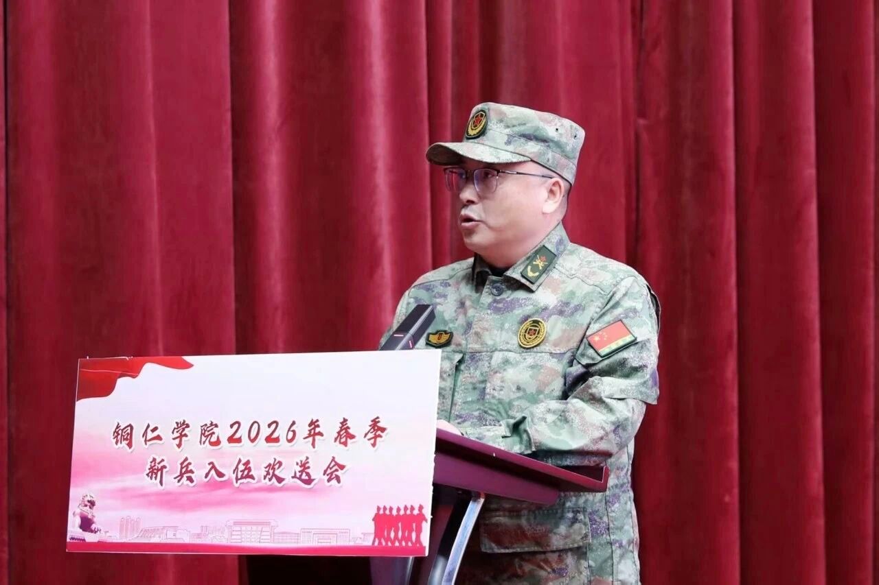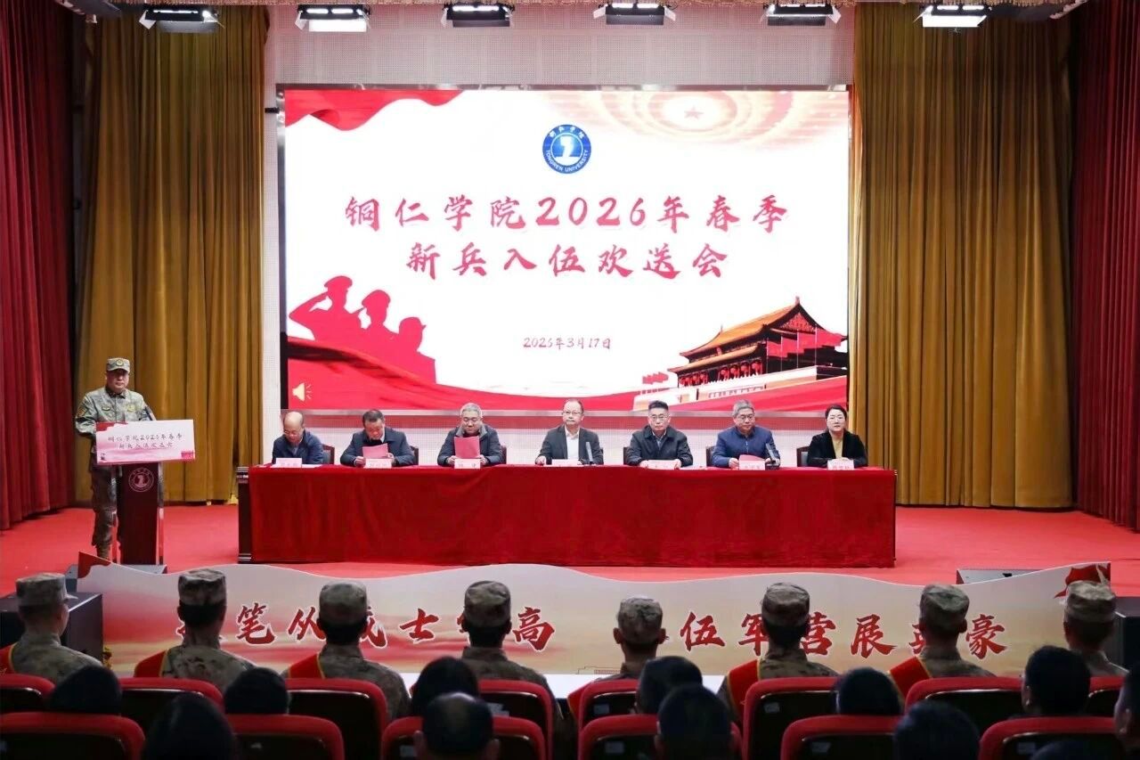 强国必须强军,军强才能国安。3月17日,我校在梵净山人文生态馆举行2026年春季新兵入伍欢送会。校党委副书记、校长石维出席会议并致欢送辞。党委副书记朱钰,副校长杨建、潘学军,纪委书记张仕凯,党委常委、组织部部长周曾艳、宣传部部长周永雄出席会议。党委学工部(人民武装部)部长张钱主持会议。