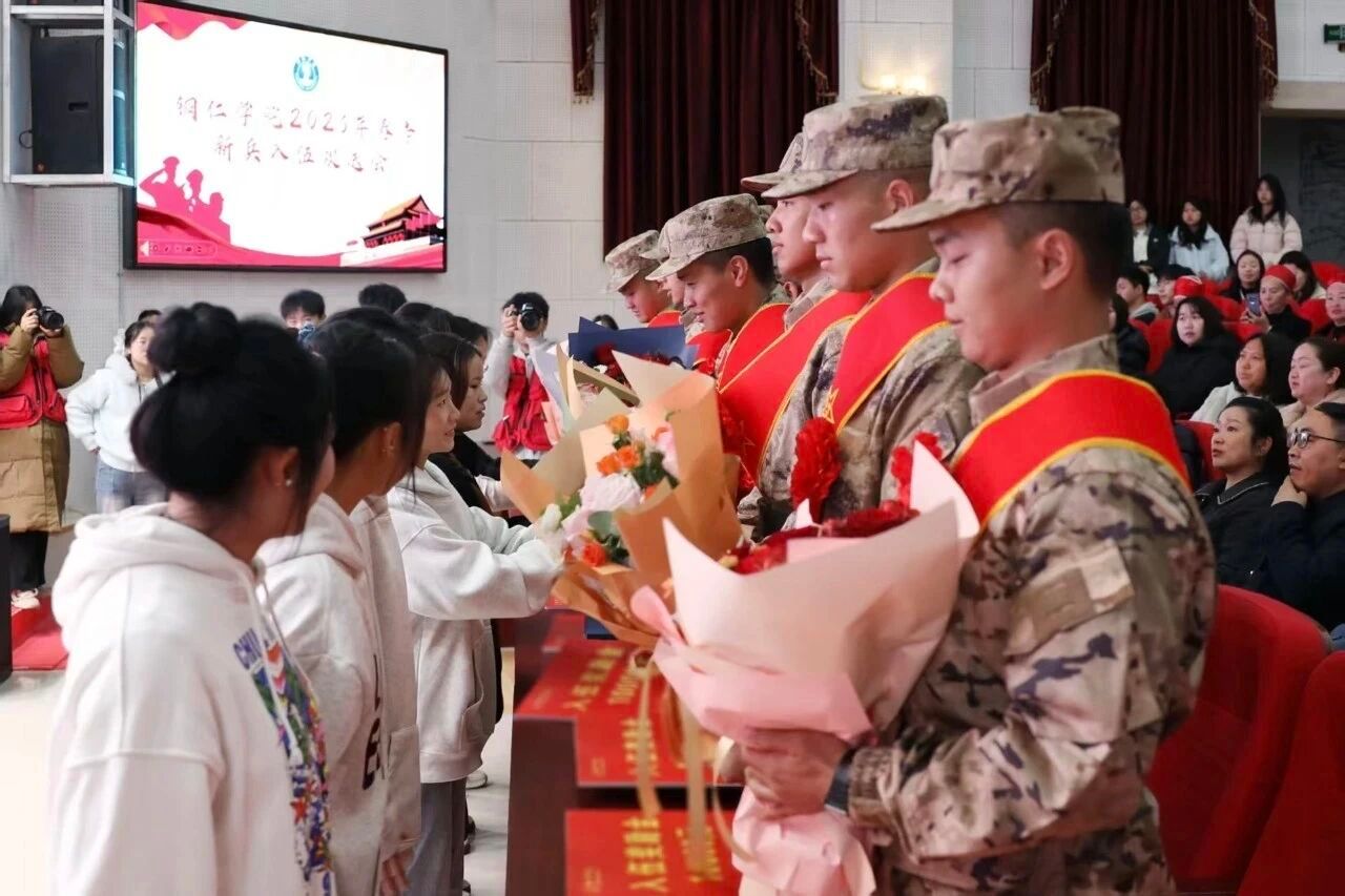 潘学军宣读入伍名单,我校2026年春季入伍学生共33人。校领导给入伍新兵代表佩戴大红花、赠送校长签名纪念品;学生代表为入伍新兵献花,向大家表达了春日出征、载誉凯旋、捷报频传的美好期许。