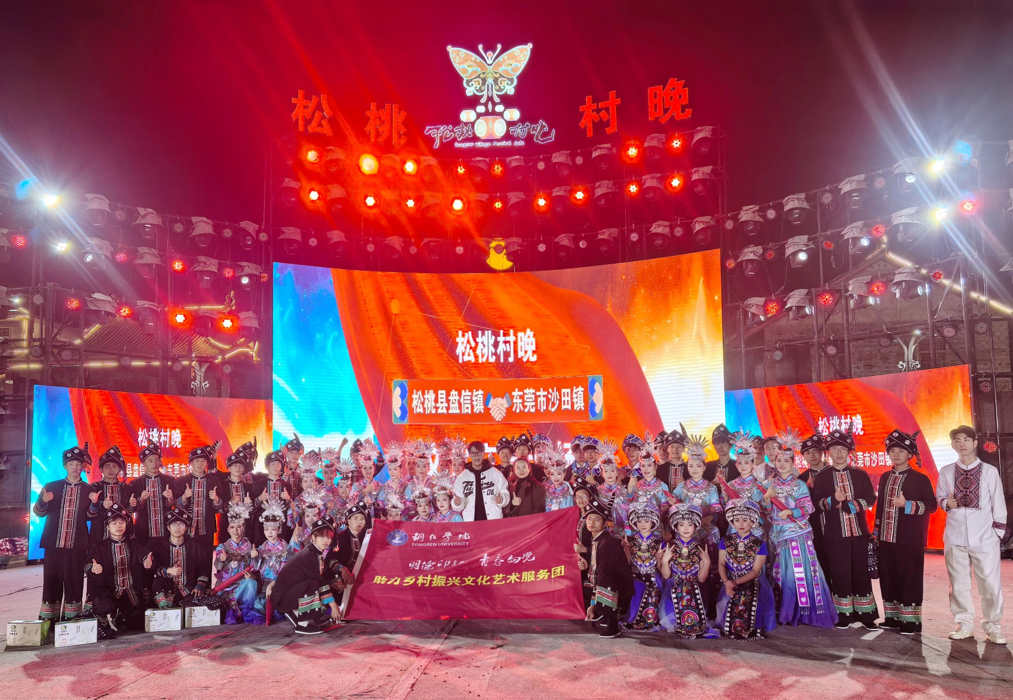近日,我校“明德印记·青春向党”助力乡村振兴文化艺术服务团一行67人,在校团委副书记田淼、教育学院杨松慧老师的带领下,再次走进“松桃村晚”舞台,与来自广东东莞沙田的文化团队联袂献艺,开展了一场别开生面的文化交流活动,用青春的创意与才华,为乡村振兴注入文化动能。