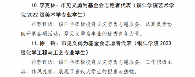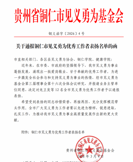 近日,学校收到了贵州省铜仁市见义勇为基金会发来的《关于通报铜仁市见义勇为优秀工作者表扬名单的函》,对其中包含我校材料与化学工程学院2023级化学工程与工艺专业学生徐铃、艺术学院2022级美术学专业学生李克林在内的12名全市见义勇为优秀工作者予以通报表扬。