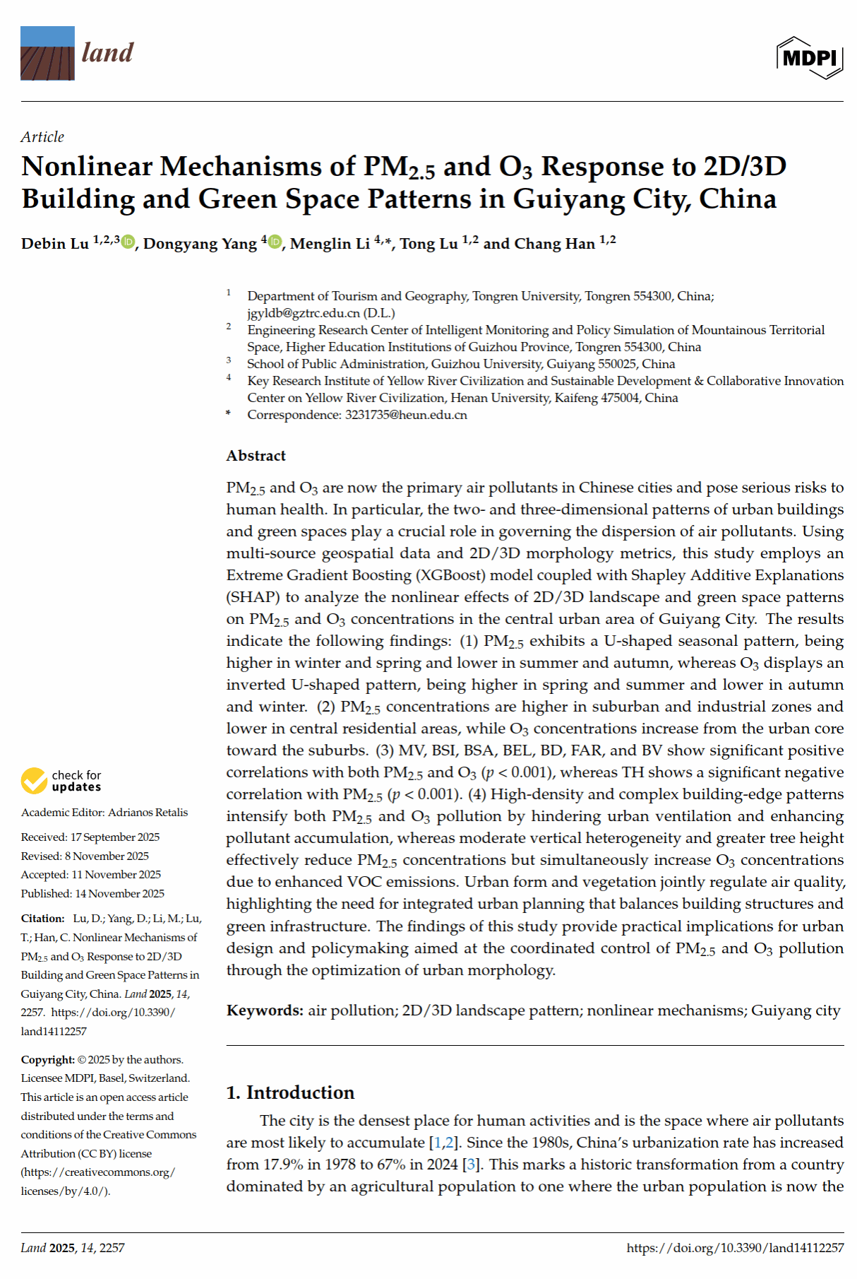 (2)以贵阳市中心城区为例,融合2D/3D建筑与绿地景观格局指数及机器学习模型,分析建筑密度、格局与植被分布对PM2.5和O3浓度的非线性影响机制。研究发现,过高或复杂的建筑布局会阻碍空气流通,导致污染累积;合理配置绿地对污染物扩散与沉降具有调节作用,研究结论从机理上证实了优化城市设计以协同治理大气污染的可行性。该成果以“Nonlinear Mechanisms of PM2.5 and O3 Response to 2D/3D Building and Green Space Patterns in Guiyang City, China”为题在《Land》(SSCI,JCR Q2分区)发表,卢德彬教授为第一作者。