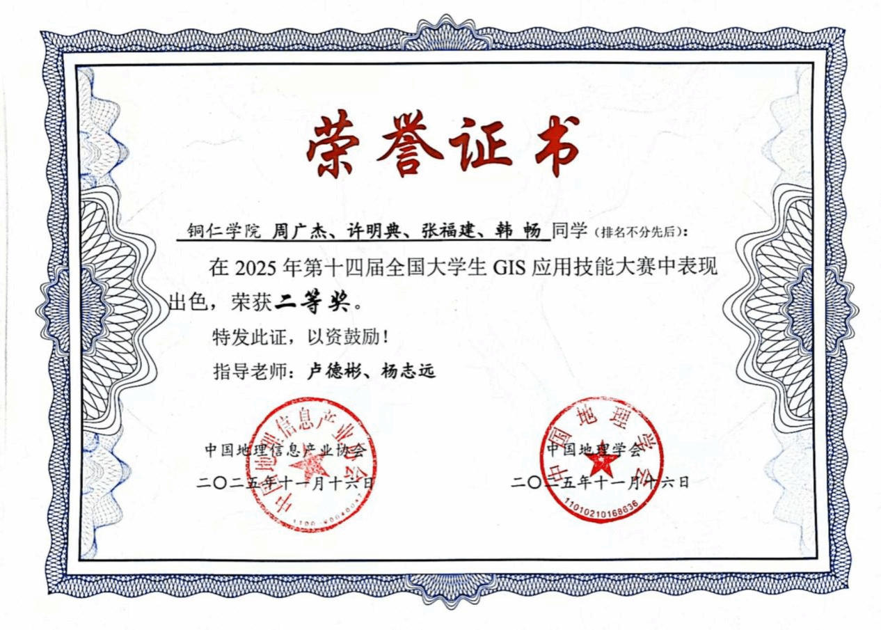 近年来,我院地理信息科学课程始终将学科竞赛与课堂教学、科研实践深度融合,注重将知识学习转化为能力塑造,引导学生成长。此次获奖既是对参赛学子辛勤付出的肯定,也是对我院人才培养工作的有力检验。未来,我院将继续深耕实践教学,着力培养更多适应行业发展需求的高素质应用型人才。