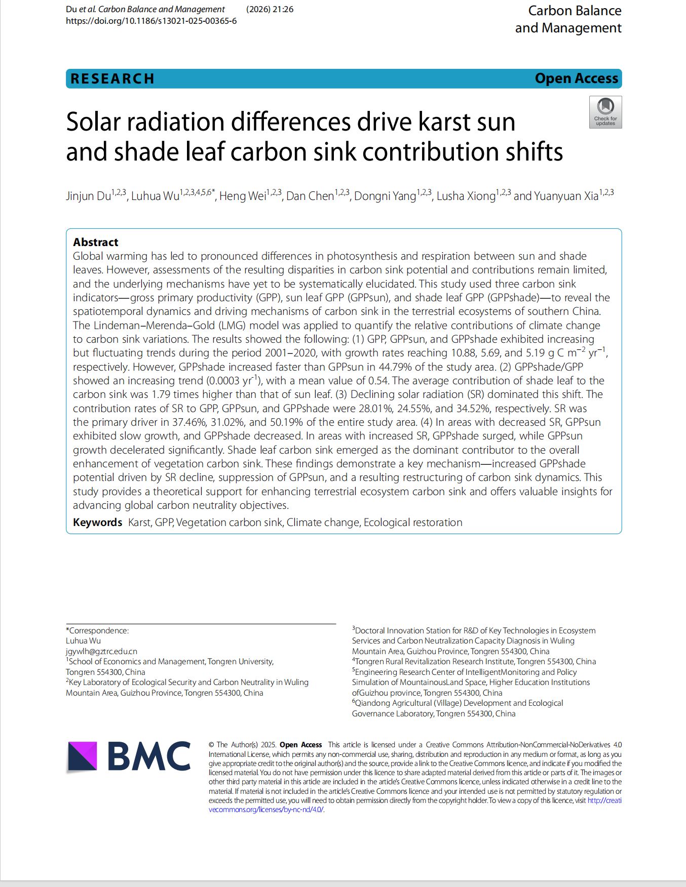 近日,我院2022级地理科学专业本科生杜进军在SCI期刊《Carbon Balance and Management》(中科院2区,IF=6.7)上发表学术论文“Solar radiation differences drive karst sun and shade leaf carbon sink contribution shifts”。铜仁学院经济管理学院为第一署名单位,杜进军为第一作者,吴路华教授为通讯作者,合作者包括2023级农村发展硕士研究生魏珩,2024级农村发展硕士研究生陈丹、杨东妮、熊露莎,以及2024级地理科学本科生夏圆圆。