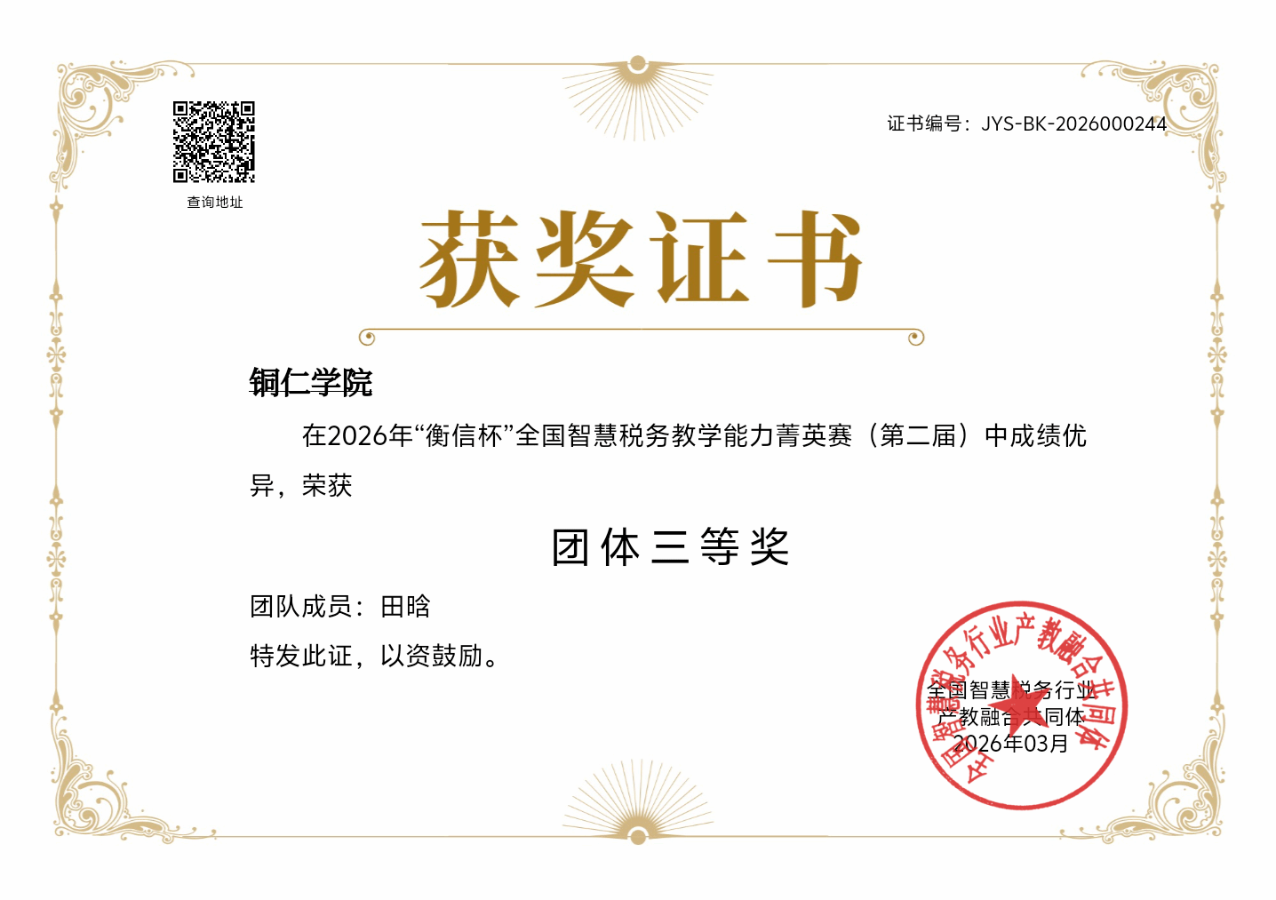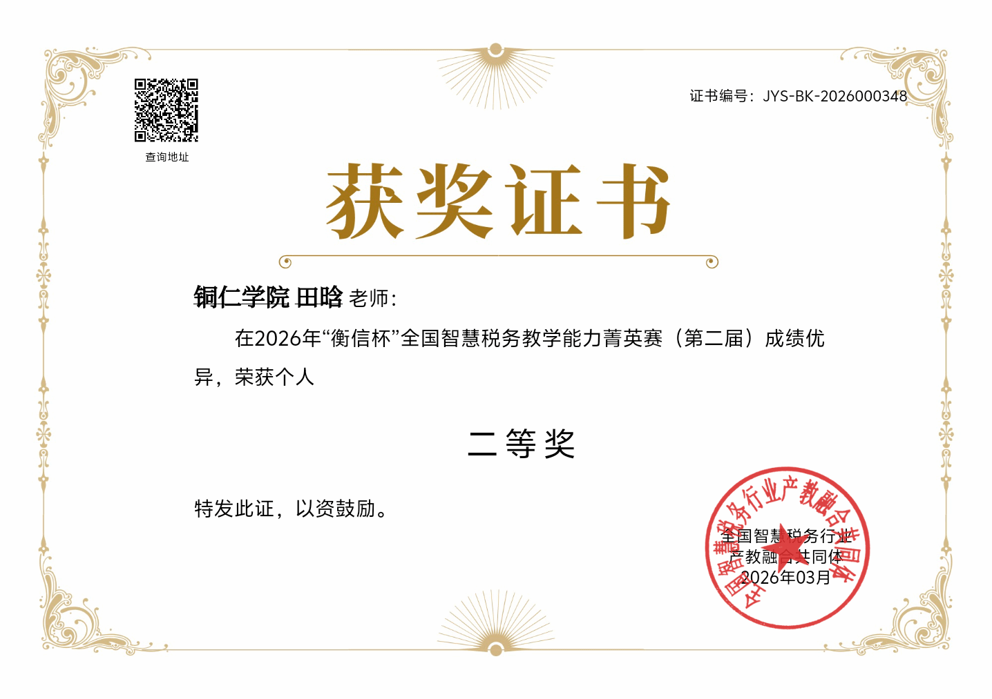 近日,第二届“衡信杯”全国智慧税务教学能力菁英赛圆满落幕。本次赛事聚焦智慧税务教学领域,吸引了全国800余所院校的2000余名教师参赛。我院会计学专业教师田晗凭借扎实的专业功底与出色的竞技表现,荣获个人二等奖;铜仁学院代表队同步斩获团体三等奖,展现了我院教师队伍的教学能力与专业风采。