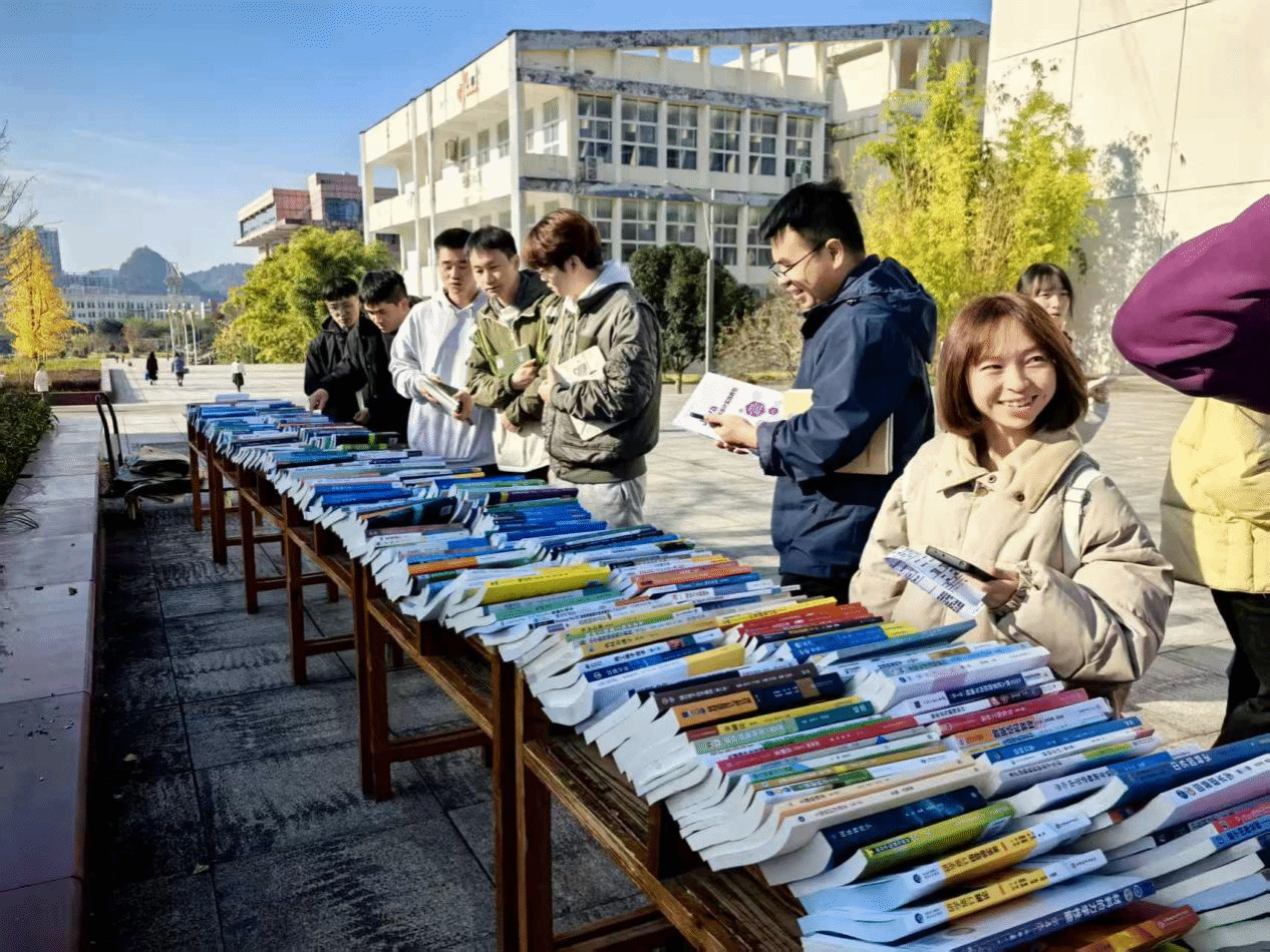 11月24日,我校成功举办2025年秋季学期校园书展活动。本次教材展示及教师样书赠送活动由我校联合贵州晨曦医学教育发展有限公司、贵州新知教育集团发展有限公司以及高等教育出版社、中国水利水电出版社、人民卫生出版社、化学工业出版社等70余家知名出版机构共同举办,地点在依仁楼和明理楼之间的活动区进行。