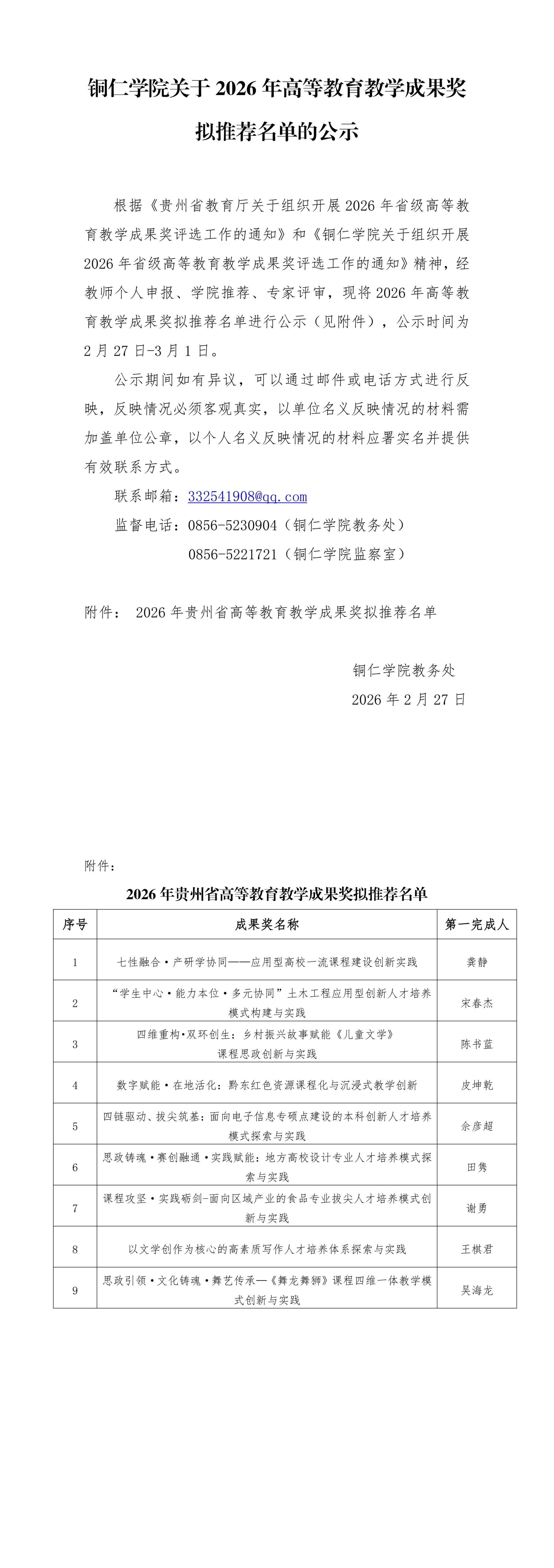 铜仁学院关于2026年高等教育教学成果奖拟推荐名单的公示