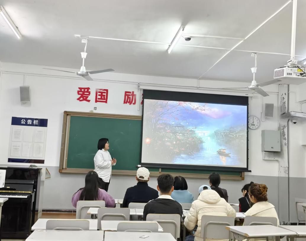 评委从教学目标契合度、逻辑衔接、情感共鸣等角度对选手表现进行实时记录与评估。展示环节结束后,评委老师作集中点评,既充分肯定了同学们在激发学生兴趣方面的积极探索,也指出了部分设计中存在的“导入与内容脱节”“语言成人化”等共性问题,并现场示范《望庐山瀑布》的导入设计,强调“导入应如‘敲门砖’,既要吸引学生,更要自然引向课堂核心”。